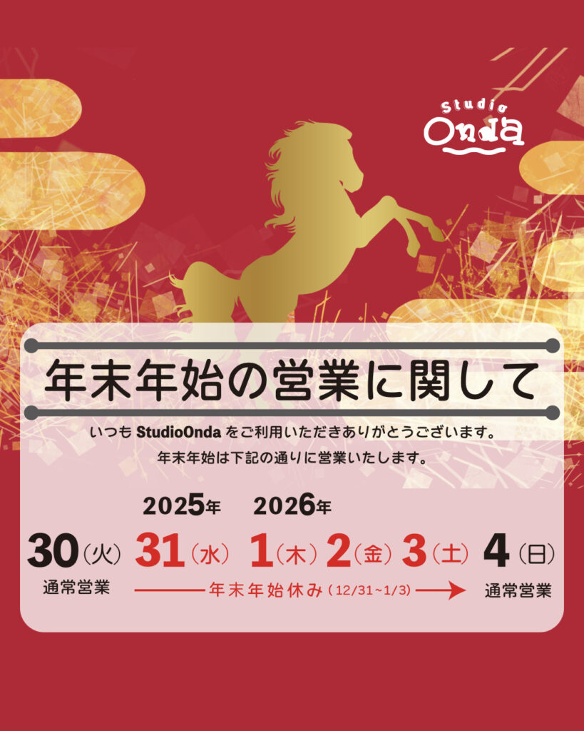 / ブログ / By kanrisya 🔔 年末年始 休業のお知らせ 🔔 誠に勝手ながら、StudioOnda大久保は下記の期間を年末年始 …